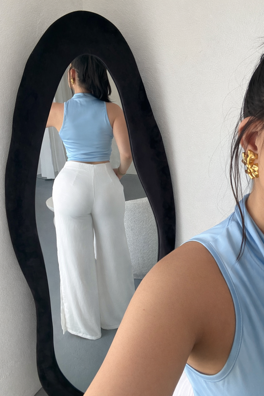 Soft sky blue wrap top with a draped neckline and adjustable waist tie. Elegant, versatile, and perfect for a polished look🩵